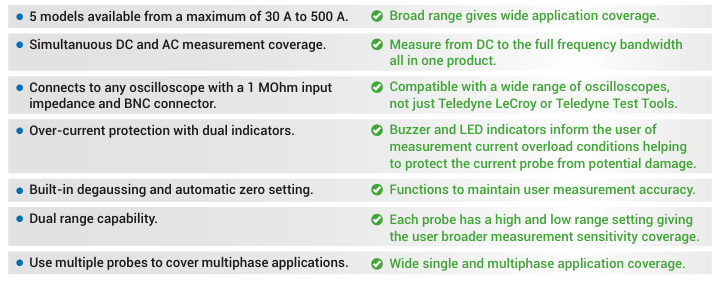 AC/DC 電流探頭由外部通用電源供電,可與任何具有高阻抗 BNC 輸入的示波器配合使用。 五種電流探頭的範圍包括頻寬高達 100 MHz、峰值電流高達 500A 和靈敏度為 1 mA/div 的型號。